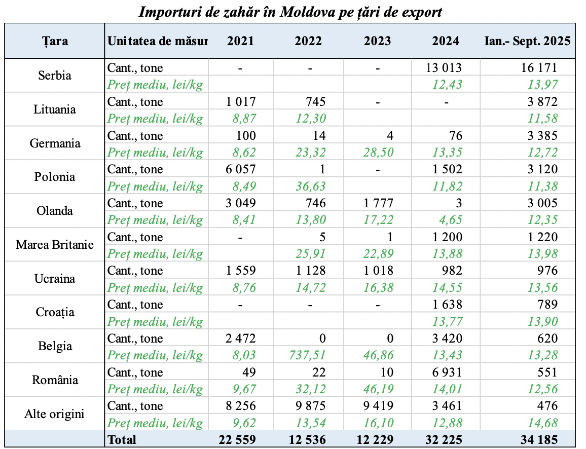 În perioada anului 2024 și ianuarie – septembrie 2025, Serbia a devenit principala sursă de zahăr importat în Republica Moldova, livrând împreună peste 29.000 de tone – mai mult de 45% din volumul total al importurilor din perioadă. Prețul mediu al zahărului din Serbia s-a situat la 12,43 lei/kg în 2024 și 13,97 lei/kg în 2025, sub nivelul mediu intern. Fără taxe vamale datorită regimului CEFTA (până la intervenția guvernului din octombrie 2025), zahărul sârbesc a fost principalul motor al importurilor masive care au pus presiune pe producția autohtonă.