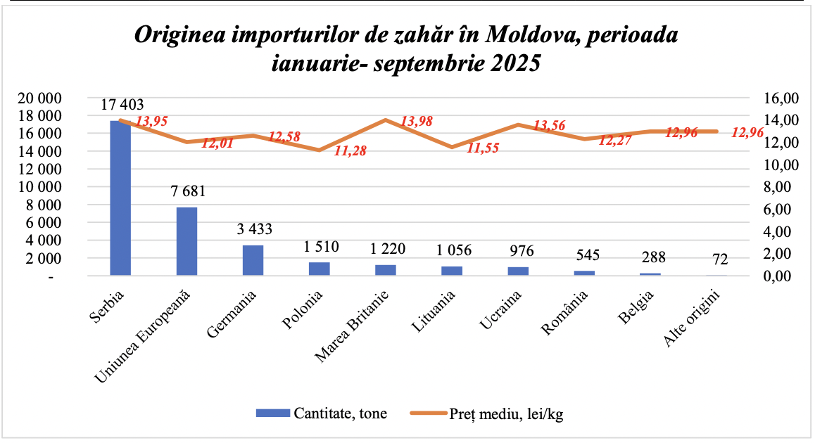 În paralel, mai multe țări din Uniunea Europeană au livrat zahăr în Moldova la prețuri chiar mai mici decât cele din Serbia. De exemplu, în ianuarie – septembrie 2025, Lituania a exportat 3.872 de tone cu un preț mediu de doar 11,58 lei/kg, iar Germania – 3.385 de tone la 12,72 lei/kg. Livrările din UE s-au încadrat în cotele tarifare preferențiale acordate în cadrul DCFTA, ceea ce le-a permis să intre pe piață fără taxe vamale. Țările UE au compensat prin prețuri mai scăzute. Prin urmare, presiunea asupra producției locale nu vine doar din Balcani, dar și din interiorul pieței europene. Diversificarea surselor accentuează concurența pe piața zahărului și complică intervențiile de protecție comercială.