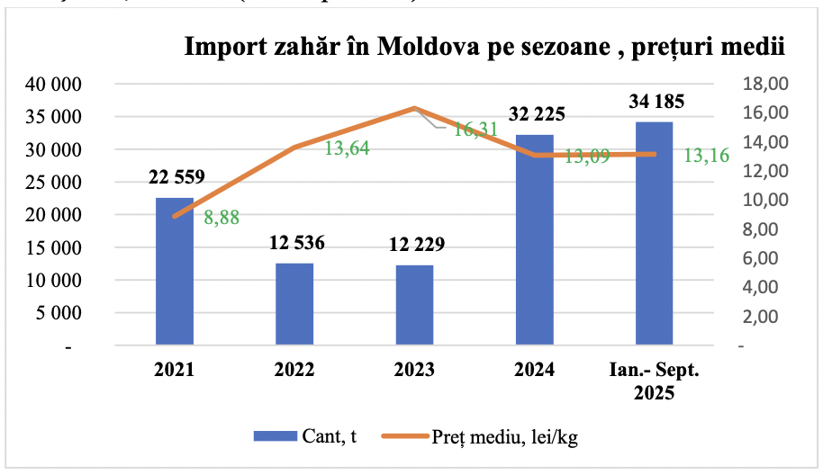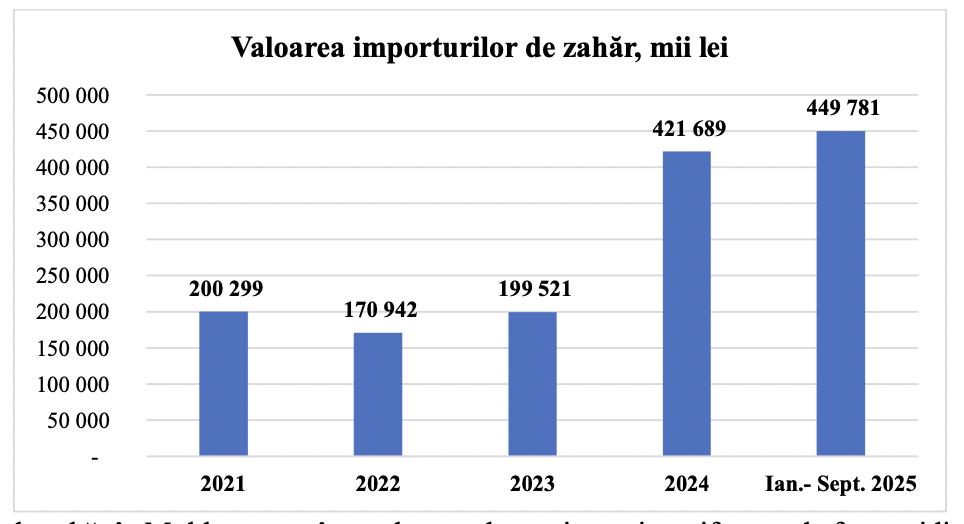 Analiza dinamicii importurilor de zahăr făcută de Iurie Rija confirmă îngrijorarea producătorilor locali - după importuri moderate în 2022–2023 (câte ~12–13 mii de tone/an), volumul achizițiilor externe de zahăr a explodat în 2024 şi 2025. Astfel, în 2024 importul a urcat la 32.225 de tone (13,09 lei/kg), iar în primele nouă luni din 2025 au intrat în țară deja 34.185 de tone (13,16 lei/kg) - chiar mai mult decât pe parcursul întregului an 2024. Creșterea volumelor s- a reflectat şi în valoarea totală a importurilor: de la ~200,3 milioane de lei în 2021 la 199,5 milioane de lei în 2023, apoi peste 421,7 milioane de lei în 2024 şi 449,8 milioane de lei (ian – sept 2025).