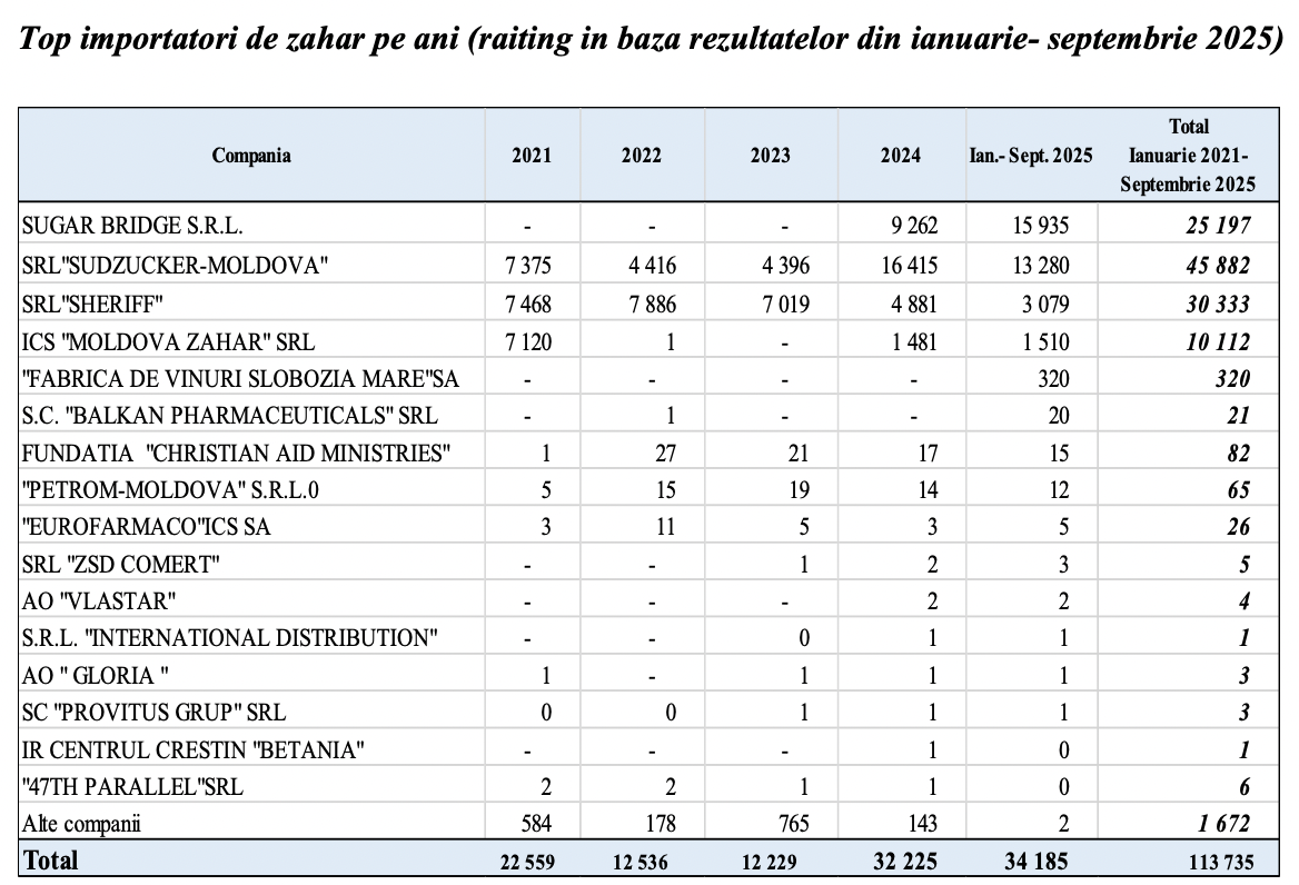 Potrivit expertului, utilizarea facilităților de import în 2024-2025 a atins cote record. Astfel, în anul 2024 s-au realizat cele mai mari importuri preferențiale de zahăr de până acum – circa 32,2 mii tone în total, iar în ianuarie- septembrie 2025 un volum și mai mare- 34,2 mii de tone. Dintre acestea, în perioada ianuarie 2024 - septembrie 2025, 31,5 mii de tone (47,4%) au provenit din UE și Marea Britanie (în baza contingentelor zero sau 10% taxe), iar 32,2 mii de tone (48,5%) au venit din Serbia, în regim liber CEFTA. Este de remarcat că circa jumătate din aceste importuri au fost realizate chiar de către producătorii autohtoni de zahăr. Spre exemplu, cel mai mare producător, Südzucker Moldova, a importat în 2024- 16,4 mii tone zahăr, iar în perioada ianuarie - septembrie 2025 -13,2 mii de tone (38% din totalul importurilor). În 2024 peste 73% din importurile Südzucker au fost aduse din Serbia. În 2025 producătorul nu a realizat importuri din Serbia. Moldova Zahăr SRL a importat în ianuarie - septembrie 2025 ~1,5 mii de tone adus din Polonia. În 2024 pe piață a apărut un nou trader privat Sugar Bridge SRL care în 2025 a devenit lider la import zahăr în Moldova, cu un volum de aproape 16 mii tone, 90% provenind din Serbia.