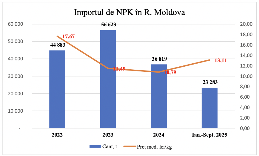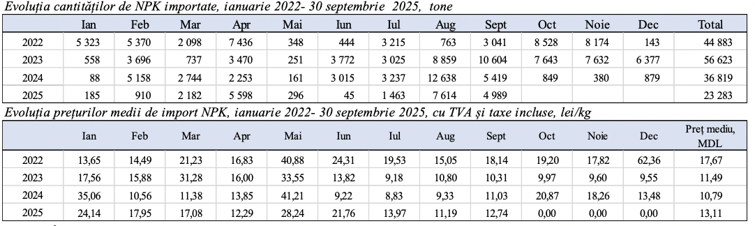 Tendințele globale s-au întors din nou în 2025, influențând puternic și piața locală. Creșterea cotațiilor la potasă și fosfați la nivel internațional (cerere sporită din Asia de Sud-Est, oferte limitate) a generat o scumpire bruscă a NPK în Republica Moldova la începutul lui 2025. În perioada ianuarie- septembrie 2025, prețul mediu de inport NPK a urcat la 13,11 lei/kg (cu 22% mai înalt ca în 2024). Scumpirea a avut imediat un efect de contracție a cererii: fermierii nu și-au mai permis să cumpere aceleași volume, astfel că importurile s-au prăbușit. Doar 23,2 mii tone de NPK au fost importate în primele 3 trimestre 2025, o cantitate cu -33% mai mică comparativ cu perioada similar 2024.