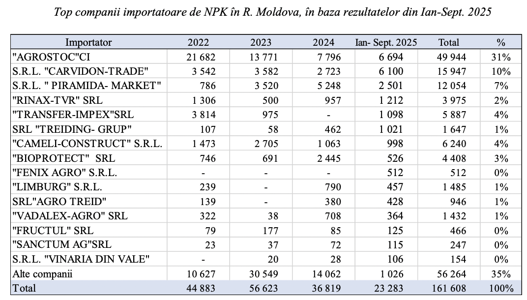 În perioada ianuarie – septembrie 2025, piața importurilor de îngrășăminte NPK din Republica Moldova a fost dominată de trei companii. „AGROSTOC” CI a rămas lider, cu un volum de 6.694 de tone, sau 29% din totalul importurilor din primele nouă luni ale anului. „CARVIDON-TRADE” SRL a urcat puternic pe poziția a doua, cu 6 100 tone, adică 26% din total, reușind să își dubleze volumul de import comparativ cu anul precedent, chiar dacă anul comercial nu s-a încheiat încă. Pe locul al treilea, „PIRAMIDA-MARKET” SRL a importat 2 501 tone, echivalentul a 11% din total, consolidându-și prezența în topul principalilor jucători. Împreună, cele trei companii au asigurat peste două treimi (circa 66%) din totalul îngrășămintelor NPK introduse pe piața moldovenească în perioada analizată.