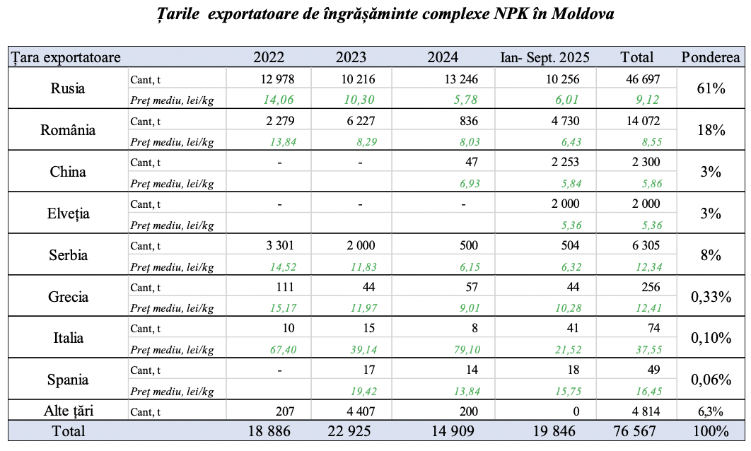 În anul curent, pe piață a apărut un nou exportator important – Emiratele Arabe Unite, care s-au plasat direct pe locul al doilea, cu un volum de 3.383 de tone, echivalentul a 14,5% din totalul importurilor moldovenești de NPK în primele trei trimestre 2025. Este remarcabil faptul că prețul oferit de Emiratele Arabe (în medie 10,40 lei/kg) este mai competitiv decât cel al Rusiei (11,22 lei/kg). Pe poziția a treia se află România, care a exportat în Moldova 3.327 de tone (circa 14,3%) la un preț mediu mai ridicat – 13,96 lei/kg, care include și marja de intermediere (NPK-ul livrat este de altă origine). Celelalte țări – Italia, Grecia, Turcia, Olanda, Polonia, Estonia și Israel – au expediat volume mai mici, cu ponderi sub 2%.