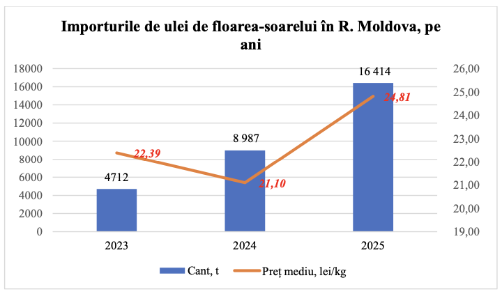 Dacă în 2023 Moldova a importat doar 4 712 tone de ulei de floarea-soarelui, în 2024 cantitatea a crescut la aproape 9 mii de tone. Tendința s-a accentuat în 2025, când importurile au ajuns la 16 414 tone, de 1,8 ori mai mult față de anul precedent și de aproximativ 3,5 ori peste nivelul din 2023.