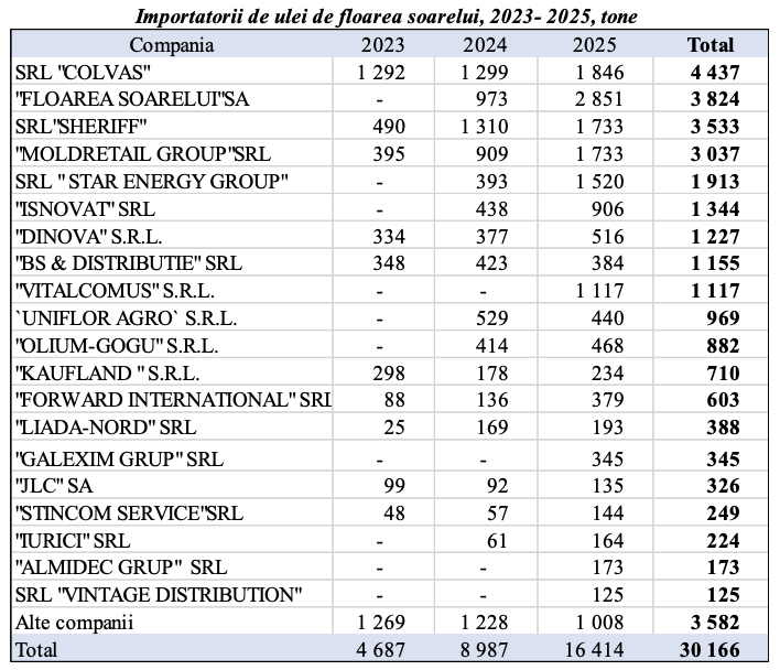 Pe locul al doilea, la nivel cumulat, se află „Floarea Soarelui” SA din Bălți, cu aproape 3,8 mii de tone importate. Mai mult, anul 2025 aduce o schimbare semnificativă în clasament, întrucât această companie devine principalul importator anual de ulei de floarea-soarelui, cu peste 2,8 mii de tone, depășind Colvas. Evoluția este legată direct de stagnarea temporară a producției interne în prima parte a anului și de necesitatea asigurării continuității livrărilor către piața locală.