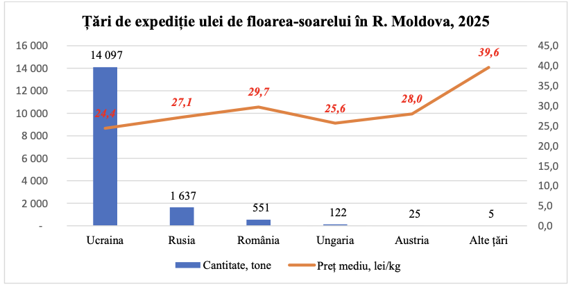 În ceea ce privește structura țărilor de expediție, datele pentru anul 2025 subliniază o dependență accentuată de Ucraina. De acolo au provenit 14 097 tone de ulei de floarea-soarelui, ceea ce reprezintă aproximativ 86% din totalul importurilor, la un preț mediu de 24,4 lei per kilogram. Pe locul al doilea se situează Rusia, cu 1 637 tone, adică circa 10% din importuri, însă la un preț mediu mai ridicat, de 27,1 lei per kilogram. Volume mult mai mici au fost livrate din România, Ungaria și Austria, la prețuri superioare mediei regionale.