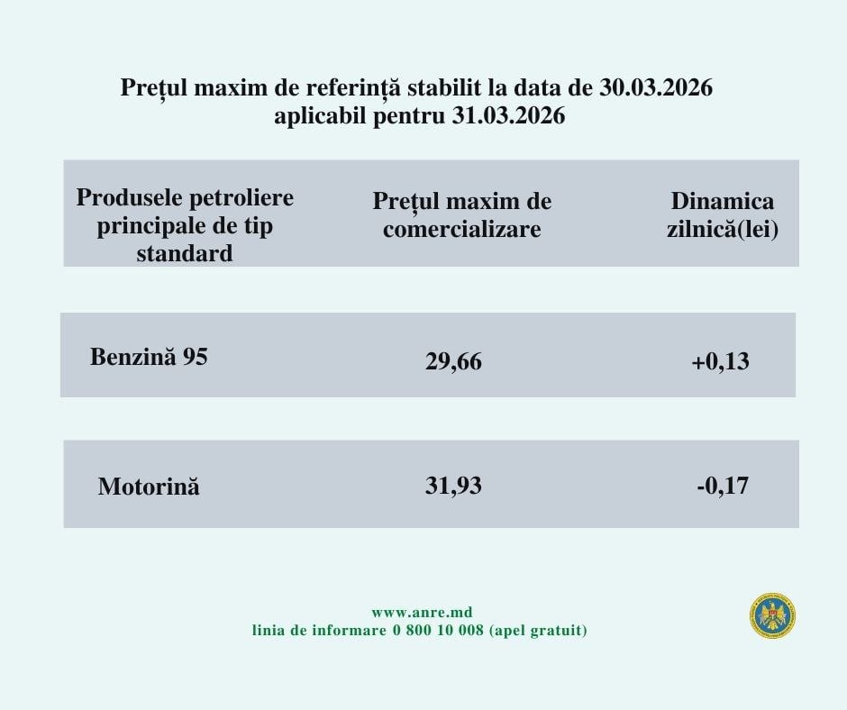 Astfel, benzina se scumpește cu 13 bani, ajungând la 29,66 lei/litru, în timp ce motorina se ieftinește cu 17 bani și va costa 31,93 lei/litru.