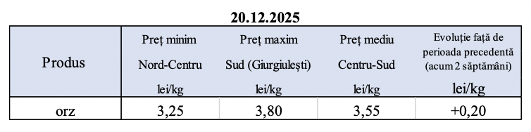 În prezent, orzul se tranzacționează la 3,80 lei pe kilogram livrat în portul Giurgiulești, în timp ce prețul mediu pe țară, în special în zonele Centru și Sud, se situează în jurul nivelului de 3,55 lei pe kilogram. Cotațiile sunt susținute de faptul că volumele disponibile în Republica Moldova sunt foarte mici, iar cantitățile rămase sunt orientate aproape exclusiv către consumul intern, în special pentru sectorul zootehnic.