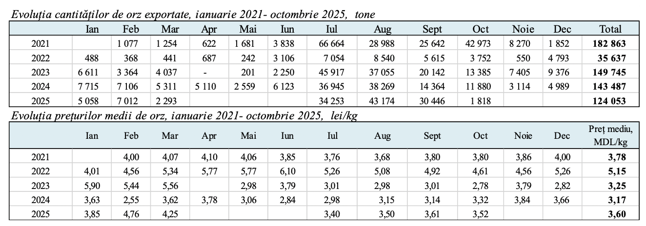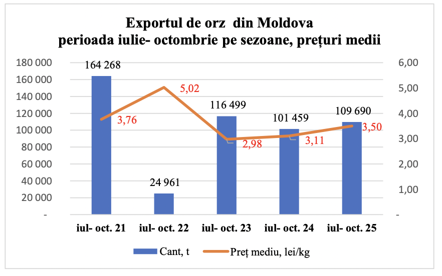 Privind imaginea de ansamblu a exporturilor din perioada iulie–octombrie 2025, observăm că Moldova a exportat 109 690 tone de orz, o ușoară creștere față de sezonul trecut, când în aceeași perioadă s-au exportat 101 459 de tone. Volumele se înscriu în același registru ca și în sezoanele anterioare – în ultimii trei ani, exporturile din primele patru luni ale sezonului s-au menținut în intervalul 110 000 – 115 000 tone.