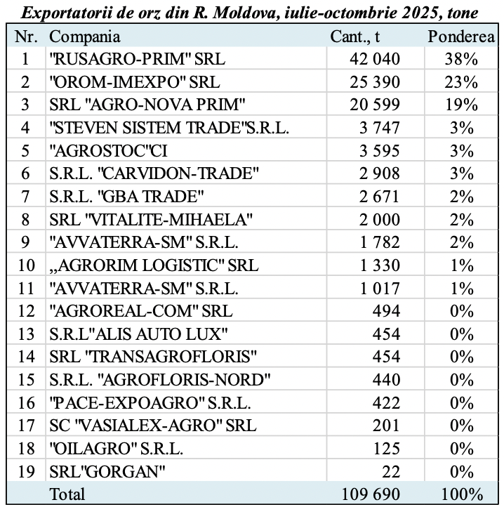 Din totalul de 109 690 tone de orz exportate în iulie-octombrie 2025, aproape 80% au fost realizate de doar trei companii. Lider absolut al pieței este "RUSAGRO-PRIM" SRL, care a exportat 42 040 tone, reprezentând 38% din totalul exporturilor. Urmează "OROM-IMEXPO" SRL, cu 25 390 tone (23%), și "AGRO-NOVA PRIM" SRL, cu 20 599 tone (19%). Trei companii au dominat fluxul de orz din Moldova, gestionând împreună peste 88 000 tone. Concentrarea exportului de orz reflectă realitatea economică actuală: orzul, ca produs sezonier cu cerere volatilă și necesități logistice ridicate (transport în barje), este operat eficient doar de companii cu volume mari și capacitate organizatorică solidă.