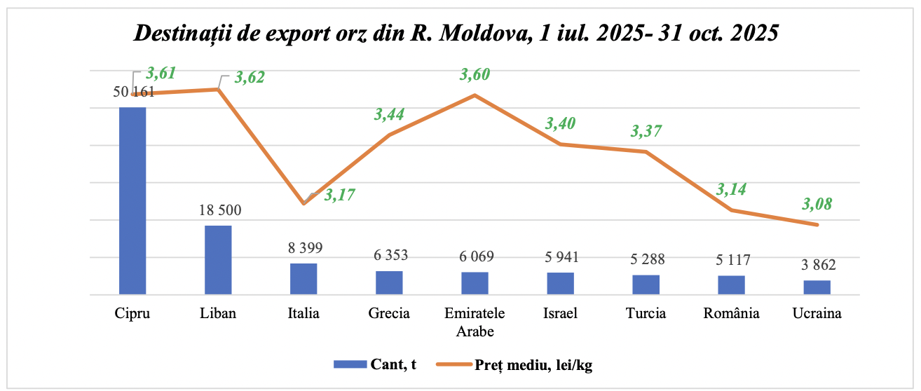 În perioada 1 iulie – 31 octombrie 2025, Cipru și Liban s-au impus ca principalele piețe de desfacere pentru orzul exportat din Republica Moldova, atât ca volum, cât și prin prisma prețurilor obținute. Cipru a absorbit 50 161 tone de orz, adică aproape jumătate din exporturile totale, la un preț mediu foarte competitiv de 3,61 lei/kg. Pe locul doi s-a plasat Libanul, cu 18 500 tone, livrate chiar la un preț puțin mai mare – 3,62 lei/kg. Cele două piețe au reprezentat împreună peste 60% din întreg volumul de orz exportat în perioada analizată.