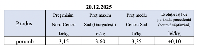 Pe piața internă, constrângerile enumerate se reflectă într-o ușoară apreciere a prețurilor. În prezent, porumbul se vinde la 3,60 lei pe kilogram în portul Giurgiulești, în jur de 3,30 lei pe kilogram în zona de centru și 3,15 lei pe kilogram în nordul Republicii Moldova. Comparativ cu luna noiembrie, creșterea este de 10 bani pe kilogram, o evoluție determinată de oferta încă limitată și de costurile suplimentare de uscare asumate de producători.