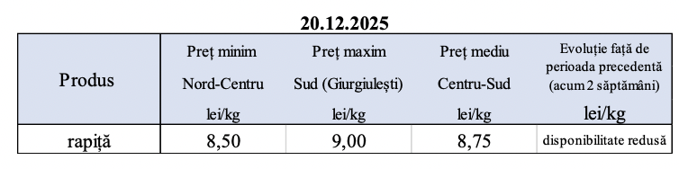 În Republica Moldova, evoluția a găsit piața relativ „descărcată” din punct de vedere al volumelor. Majoritatea fermierilor și-au valorificat deja rapița disponibilă, profitând de nivelurile de preț mai bune din perioadele anterioare. În prezent, doar câteva gospodării mai dețin stocuri, de ordinul a o mie de tone sau mai mult, însă așteptările rămân ridicate, cu praguri de vânzare peste 10 lei pe kilogram. Tendința de moment a pieței nu susține însă niveluri date, iar sentimentul dominant este de continuare a presiunii de scădere.