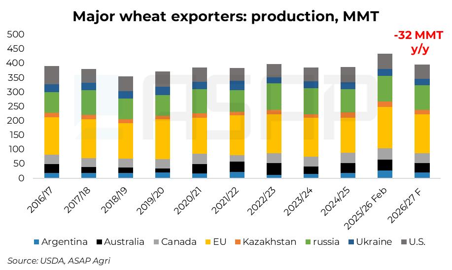 Впрочем, вперед рынок смотрит менее спокойно. Предыдущие прогнозы на 2026/27 сигнализируют о примерно 7–8% снижении производства в восьми ключевых экспортерах, что эквивалентно в среднем около 32 млн т.