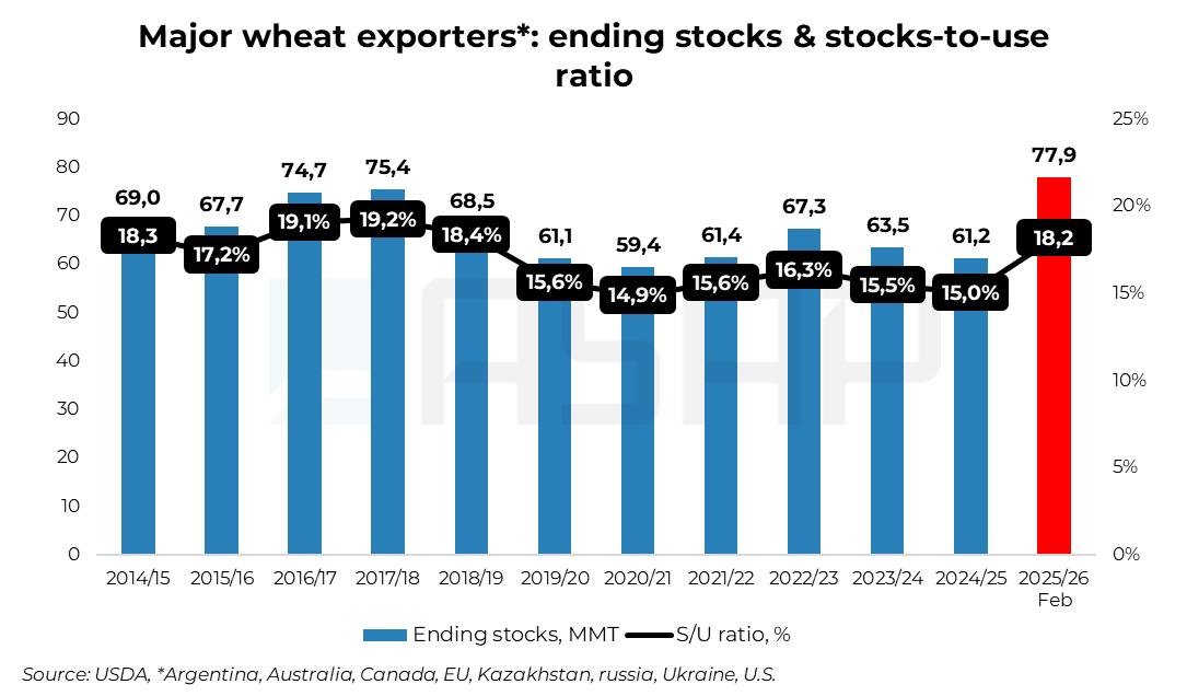 Сезон 2025/26 более чем комфортен для рынка пшеницы. Мировое производство достигло рекордных 842 млн т, переходные остатки высоки, а соотношение запасов к потреблению в ключевых экспортерах – США, Канаде, Австралии, Аргентине, ЕС, России, Украине и Казахстане – составляет около 18%.