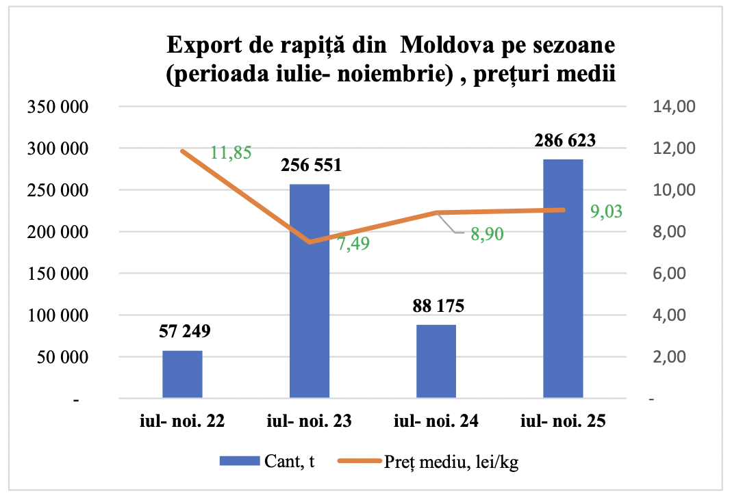 Potrivit analizei lui Iurie Rija, în perioada iulie–noiembrie 2025, din Republica Moldova au fost livrate peste 325 000 de tone de rapiță, atât ca materie primă, cât și sub formă procesată. Din acest total, 88% a reprezentat rapiță brută, iar 12% ulei de rapiță. Volumul atins depășește toate așteptările pentru cultura respectivă și confirmă interesul tot mai mare al fermierilor moldoveni pentru oleaginoase — rapiță și floarea-soarelui — datorită prețurilor ridicate și cererii solide pe piața Uniunii Europene.