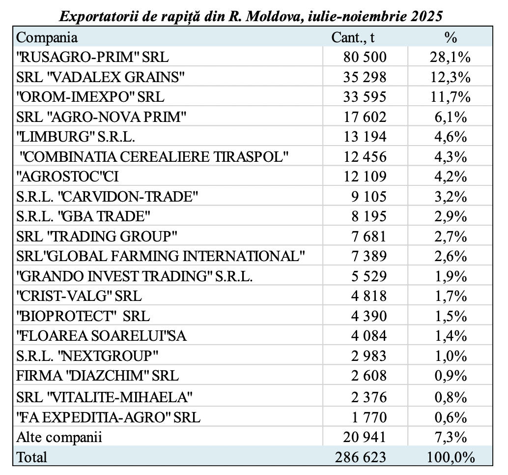 Exporturile s-au concentrat puternic în rândul principalilor traderi. Aproximativ jumătate din cantitatea totală exportată între iulie și noiembrie 2025 a fost livrată de doar trei companii: „RUSAGRO-PRIM” SRL (80 500 t; 28,1%), „VADALEX GRAINS” SRL (35 298 t; 12,3%) și „OROM-IMEXPO” SRL (33 595 t; 11,7%). Primele 20 de companii exportatoare cumulează 92,7% din total.