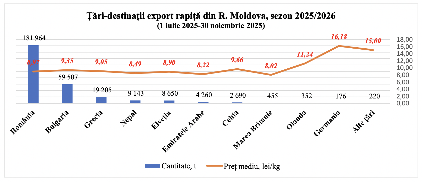 În luna noiembrie 2025, exporturile au totalizat 7 244 tone, expediate exclusiv pe cale rutieră — un indicator al încheierii sezonului comercial. Volumul redus față de lunile anterioare confirmă trendul anticipat încă din septembrie, când ritmul de livrare a început să scadă după exodul intens din lunile iulie–august. Rapița exportată în noiembrie a avut un preț mediu de 9,12 lei/kg, mai mic decât cel din octombrie (10 lei/kg), ceea ce reflectă o cerere aflată în retragere specifică finalului de sezon.