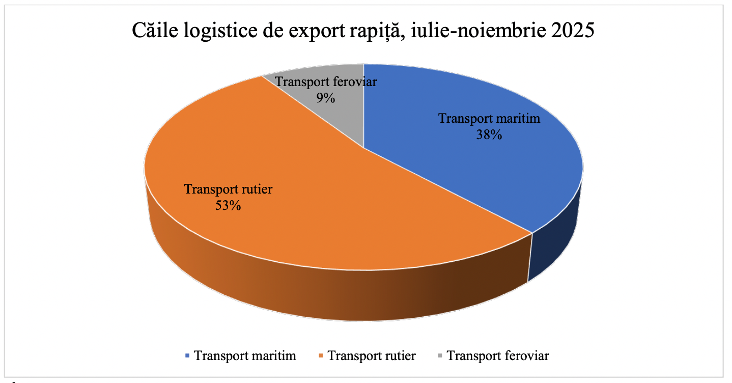 Fluxurile logistice evidențiază predominanța transportului rutier — 150,8 mii tone, adică 53% din totalul sezonului. Transportul maritim a urmat cu 109,5 mii tone (38%), o pondere în creștere datorită accesului la piețe mai îndepărtate. Transportul feroviar a însumat 26 337 tone (9%) și s-a oprit complet începând cu luna octombrie.