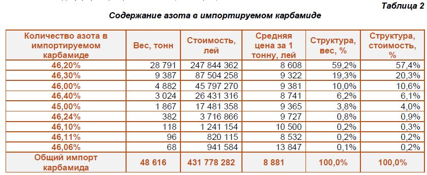 Анализ содержания азота в импортируемом карбамиде выявляет интересную картину качественной дифференциации поставок (таблица 2).