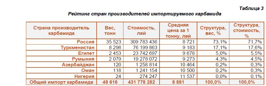 Географическая структура импорта карбамида в Молдову демонстрирует очевидное доминирование России, которая обеспечила 35,5 тыс. тонн поставок стоимостью 309,8 млн леев (таблица 3).
