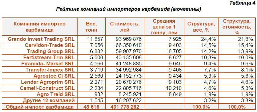 Импорт карбамида в Молдову в 2025 году осуществляли 22 компании, однако распределение объемов между ними крайне неравномерно (таблица 4).