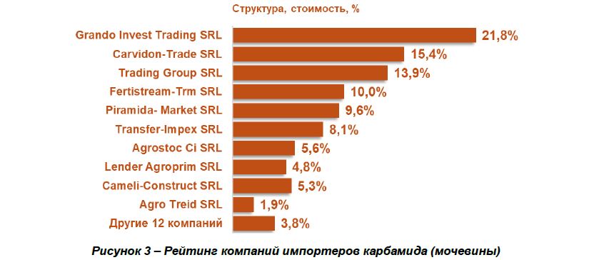 Fertistream-Trm SRL (пятая по объему с 5 тыс. тонн) представляет особый интерес, поскольку полностью сфокусирована на туркменском направлении. Средняя цена закупок компании составила 8 627 леев, что существенно ниже средней цены туркменского карбамида по рынку (9 183 лея). Это