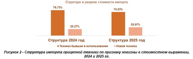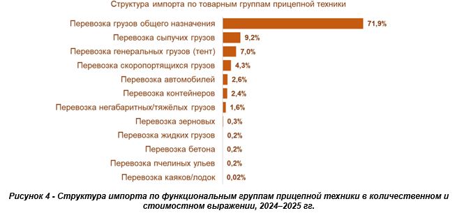 С точки зрения товарной структуры рынок остается двухполюсным. Полуприцепы составляют 40 % в натуральном выражении и более 88 % в денежном. Именно они формируют инвестиционную основу рынка, и именно в этом сегменте сосредоточены основные закупки транспортных компаний. Грузовые прицепы общего назначения — это массовый низкоценовой спрос, в значительной степени обусловленный аграрным сектором.