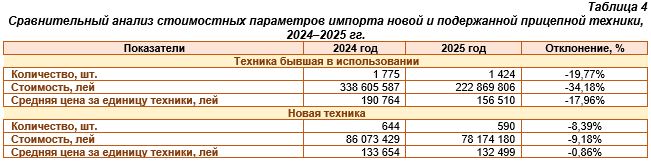 Здесь мы видим принципиальное различие между двумя сегментами. Средняя цена подержанной единицы техники упала со 190,8 тыс. леев в 2024 году до 156,5 тыс. леев в 2025-м — снижение на 18,0%. Это весьма ощутимое падение, которое свидетельствует либо о притоке более старых и простых машин, либо о избыточном предложении на рынке подержанной техники в странах-экспортёрах.