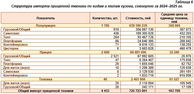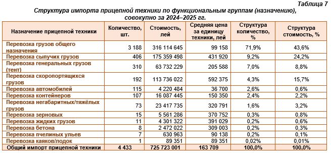 Прицепы — 2,6 тыс. штук (58,7% от общего количества), но лишь 11,6% от общей стоимости (84,1 млн леев). Их средняя цена — 32,2 тыс. леев, что в десятки раз ниже стоимости полуприцепов. В этой категории абсолютно доминируют грузовые прицепы общего назначения: 2,5 тыс. единиц по цене около 27 тыс. леев — по всей видимости, это массовые сельскохозяйственные прицепы, которые ввозят в основном фермеры.
