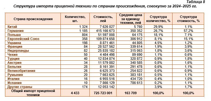 По количеству единиц первое место занимает Китай — 1,3 тыс. штук, то есть 29,9% от общего объема ввоза. Однако в денежном выражении это всего 7,6 млн леев — 1,1% рынка, а средняя цена одной китайской единицы техники составляет всего 5,8 тыс. леев. Очевидно, что речь идет о массовых легких прицепах бюджетного класса, которые ввозятся оптом.