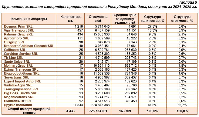 За два анализируемых года прицепную технику импортировали в общей сложности 847 молдавских компаний — внушительная цифра, свидетельствующая о том, что рынок остаётся децентрализованным и конкурентным. При этом концентрация среди 20 крупнейших импортёров (таблица 9) весьма умеренная.