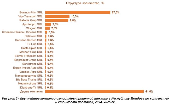 Крупнейший импортёр — Bosmos-Prim SRL: 1,2 тыс. единиц, или 27,5% от общего объёма. Однако его доля в стоимостном выражении составляет всего 0,8% (5,7 млн леев), а средняя цена единицы товара — 4,7 тыс. леев. Это классический оптовый продавец лёгких массовых прицепов — возможно, именно тех китайских изделий, которые преобладают в количественной статистике. Аналогичный профиль у компаний Vipr-Transport SRL (457 ед., 14,2 тыс. леев/ед.) и Ralionis Grup SRL (434 ед., 34,6 тыс. леев/ед.).