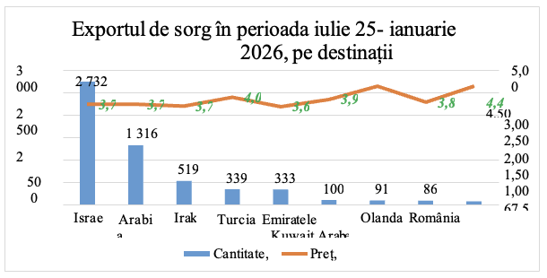 Structura exporturilor de sorg în perioada iulie 2025 – ianuarie 2026 arată o orientare spre piețele din Orientul Mijlociu, care absorb majoritatea volumelor livrate din Republica Moldova. Israelul ocupă primul loc, cu 2 732 tone la un preț mediu de 3,72 lei/kg, urmat de Arabia Saudită cu 1.316 tone la același nivel de preț, ce înseamnă că doar aceste două destinații concentrează peste jumătate din totalul exporturilor sezonului. Irak, Turcia, Emiratele Arabe și Kuwait completează tabloul regional, cu prețuri variind între 3,63 și 3,98 lei/kg.