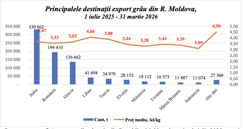 Structura geografică a exporturilor de grâu din Republica Moldova în perioada iulie 2025 –martie 2026 relevă o dependență de piețele europene, în special de bazinul mediteranean. Italia rămâne, de departe, principala destinație, absorbind 330 862 de tone — aproape 40% din totalul exporturilor, la un preț mediu de 3,67 lei/kg. România ocupă loculal doilea, cu 194 410 tone exportate, la un preț mediu mai modest de 3,53 lei/kg. Grecia, cu 136 662 de tone la 3,65 lei/kg, consolidează importanța Mediteranei ca spațiu de absorbție pentru grâul moldovenesc. Porturile grecești funcționează în parte ca hub-uri de redistribuire spre alte destinații. Libanul reprezintă o destinație notabilă nu atât prin volum — 41 898 de tone — cât prin prețul mediu cel mai ridicat, de 4,06 lei/kg.