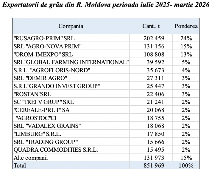 Topul exportatorilor pentru sezonul iulie 2025 – martie 2026 este dominat de trei jucători majori care acoperă împreună peste jumătate din totalul volumului exportat: "RUSAGRO-PRIM" SRL se detașează ca lider incontestabil al sezonului, cu 202 459 de tone exportate, reprezentând 24% din totalul național. Compania păstrează astfel poziția de forță pe care o deține în mod tradițional pe piață.
