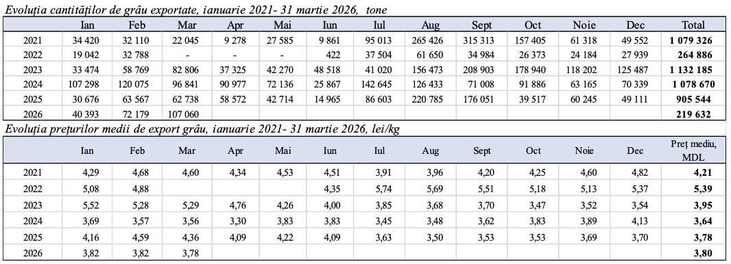 Potrivit statisticilor pentru perioada iulie 2025 – martie 2026, din Republica Moldova au fost exportate 851 944 de tone de grâu, cu 18% mai mult față de 722 457 de tone înregistrate în perioada similară a sezonului precedent (iulie 2024 – martie 2025). La prima vedere, cifrele par încurajatoare. Cu toate acestea, prețul mediu de export a coborât la 3,62 lei/kg, față de 3,84 lei/kg în sezonul trecut — o scădere de 6%. Combinația între volum mai mare dar la un preț mai mic — a atenuat câștigurile potențiale ale exportatorilor.