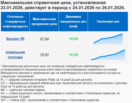 По информации от регулятора, предельная цена на бензин A‑95 поднимется до 22 леев 94 банов за литр, что на 4 бана больше, чем сейчас. Стоимость стандартного дизельного топлива (не брендированного) тоже возрастёт — до 19 леев 62 банов за литр, то есть подорожание составит 9 банов.
