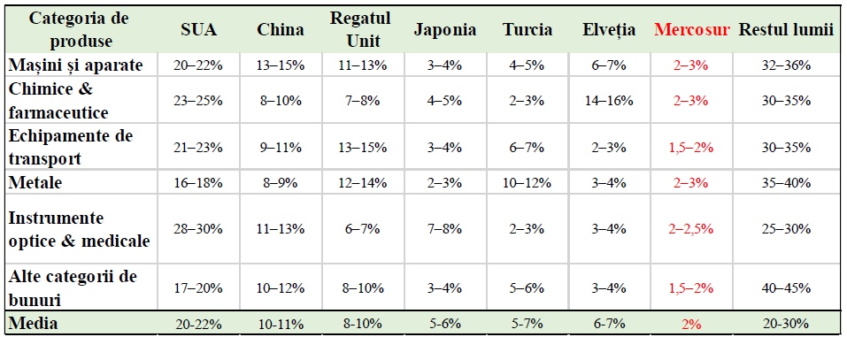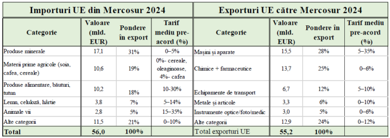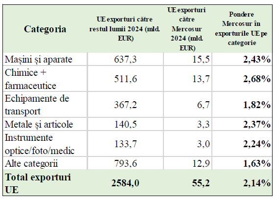Analiza structurii comerciale arată că, până în prezent, statele Mercosur au avut o importanță relativ redusă pentru exporturile Uniunii Europene. În anul 2024, exporturile totale ale Uniunii Europene către restul lumii s-au ridicat la 2 584 miliarde de euro, din care doar 55,2 miliarde de euro au avut ca destinație țările Mercosur. Astfel, blocul Mercosur a reprezentat doar 2,14% din totalul exporturilor UE. Fie că vorbim despre mașini și aparate, produse chimice și farmaceutice, echipamente de transport, metale sau instrumente optice și medicale, ponderea Mercosur în exporturile europene pe fiecare segment se situează constant între 1,5% și 2,7%, mult sub nivelurile înregistrate în relația cu SUA, China, Regatul Unit sau chiar Turcia și Elveția. Din perspectiva dată, Mercosur este pentru Uniunea Europeană abia al șaptelea partener comercial.