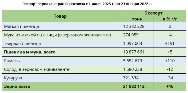 За тридцать недель текущего сезона, который начался 1 июля 2025 г., страны Евросоюза экспортировали 21,982 млн т зерна и продуктов его переработки, что на 16% больше, чем за аналогичный период в сезоне 2024/2025.
