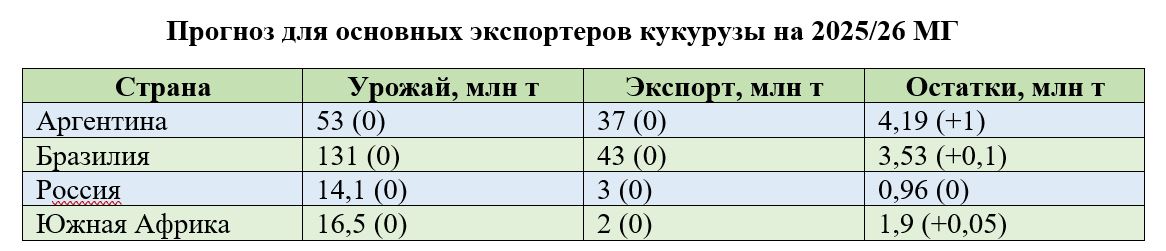 Аналитики USDA прогнозируют мировое производство кукурузы в 2025/26 МГ на уровне 1286,23 млн т (-0,35 млн т к предыдущему прогнозу). Оценка мирового экспорта кукурузы – 203,47 млн т (+1,76 млн т), прогноз конечных запасов – 281,34 млн т (-0,06 млн т). Об этом говорится в отчете USDA за ноябрь.