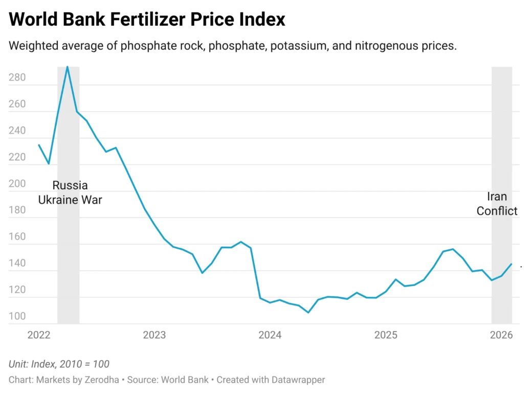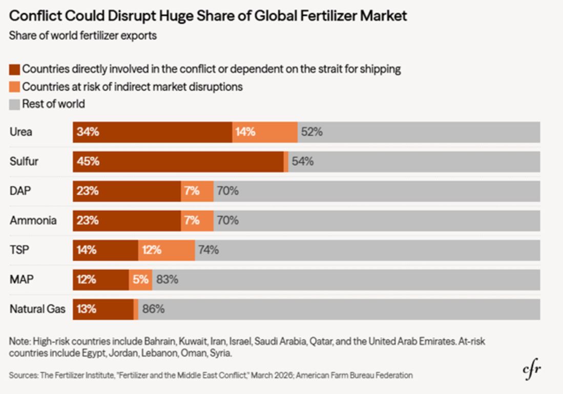 Новый кризис осложнился из-за начала войны в Иране и последующей блокировки Ормузского пролива. Это привело к резкому сокращению перевозок удобрений через Персидский залив, который обеспечивает примерно треть мирового экспорта азотных удобрений и значительную часть фосфатных и серных удобрений.