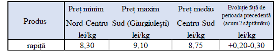 În prezent, prețurile rapiței înregistrează o creștere de 0,20–0,30 lei/kg față de cele din perioada de acum 2 săptămâni. În regiunile de nord și centru, cotațiile variază între 8,30 și 8,60 lei/kg, în timp ce în sud, mai ales în zona portuară Giurgiulești, prețurile ajung la 8,80–9,10 lei/kg. Media regională se situează la 8,75 lei/kg. În portul Constanța, rapița se tranzacționează la 470 euro/tonă (echivalentul a 9,1 lei/kg), un nivel similar celui înregistrat în sudul Republicii Moldova. Paritatea arată că rapița moldovenească rămâne competitivă în fluxurile comerciale regionale.