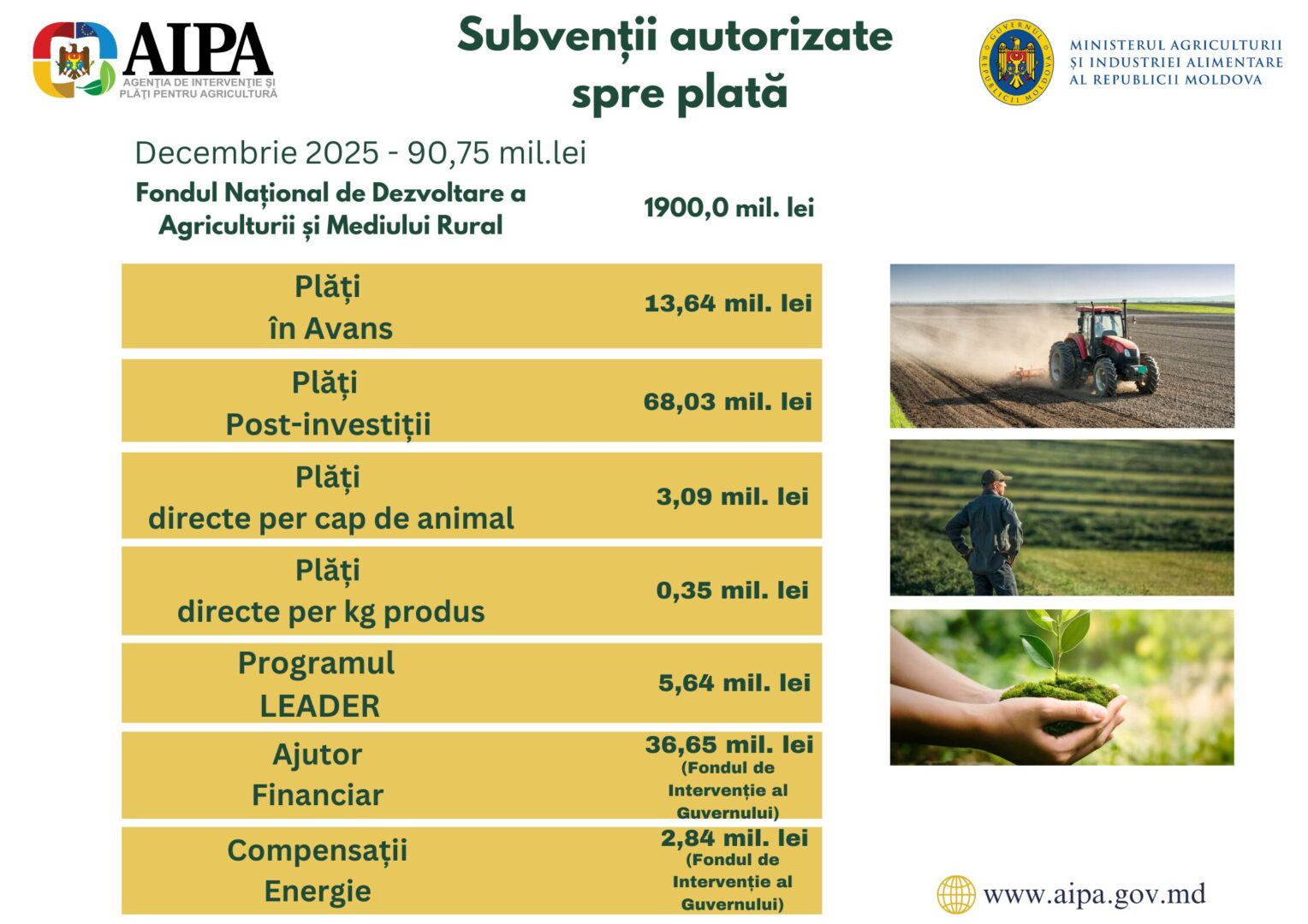 Fermierii au beneficiat, în luna decembrie 2025, de subvenții în valoare totală de 90,75 milioane de lei, sume autorizate spre plată pentru diverse măsuri de sprijin din sectorul agricol. Banii au fost direcționați atât pentru investiții, cât și pentru plăți directe și compensarea pierderilor provocate de condițiile climaterice și de creșterea costurilor energetice.